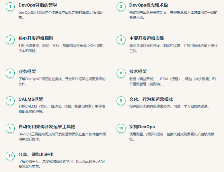 建议 参与IT开发、IT运营或IT服务管理的个人 需要了解DevOps原则的个人 在敏捷服务设计环境内工作或即将进入该环境的IT专业人员 自动化架构师、应用开发人员、业务分析师、业务经理 业务利益相关者、变革代理、咨询师、DevOps顾问 DevOps工程师、基础设施架构师、集成专家 IT主管、IT经理、IT运营、IT团队领导、精益教练 网络管理员、运营经理、项目经理、发布工程师 软件开发人员、软件测试员/QA、系统管理员 系统工程师、系统集成商、工具提供商 都来学习DevOps并考取DevOps证书。