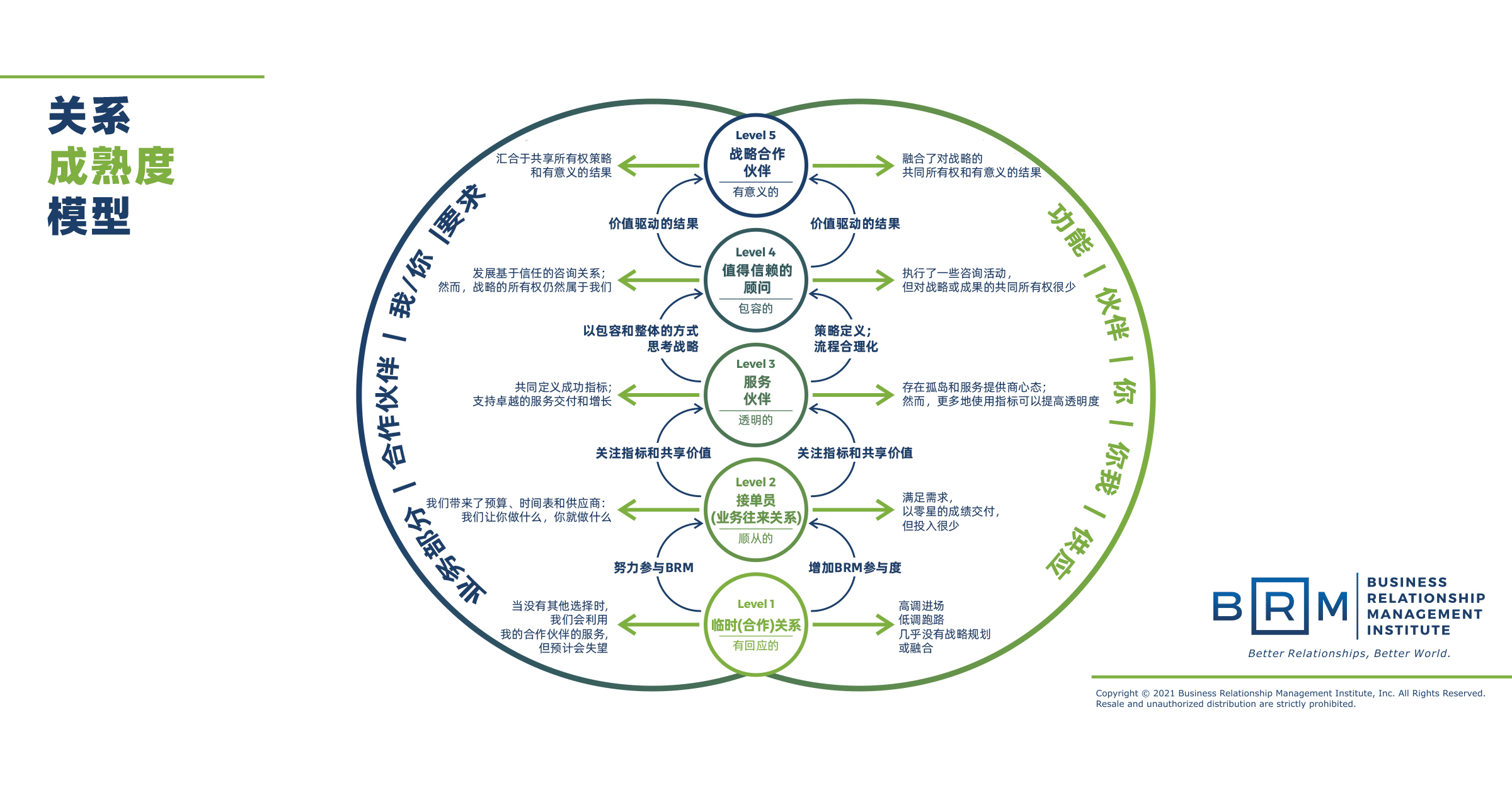 BRMP帮助学员掌握建立合作伙伴关系方面的能力,BRM的关系成熟度模型定义了关系成熟度的五个级别,如下: