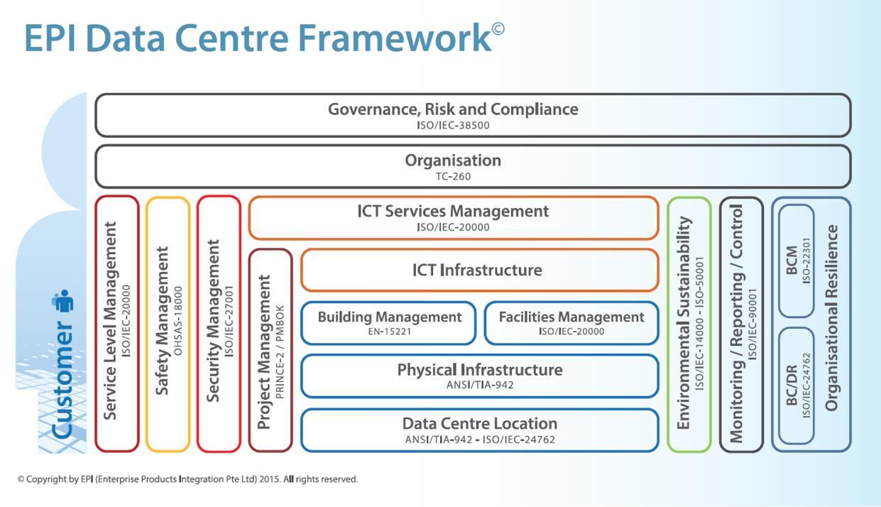 EPI 数据中心框架(EPI Data Center Framework)为数据中心的投资方、所有者、运营方提供了一套数据中心生态系统,涵盖了全面管理的结构化数据中心的所有科目。这套 EPI 数据中心框架不仅介绍数据中心位置选择、实体设备设计和配备,还说明了管理内容及根据客户的业务需求进行数据中心组织和运营所需的全部流程。