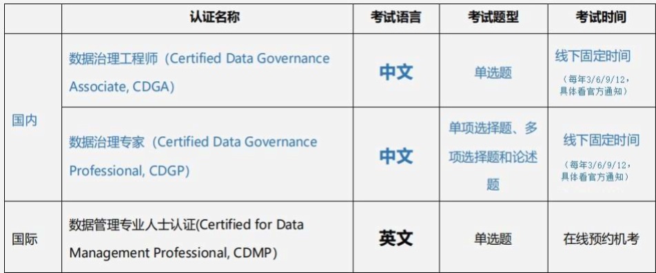 为了便于国内广大数据从业者参加CDMP认证,由数据管理国际协会中国分会(上海静安国际数据管理协会,DAMA中国)结合国内实际需求对CDMP认证考试的考试语言、考试形式、证书名称、证书类型等进行了适当的本地化重构,重构后认证分为:数据治理工程师(助理级,Certified Data Governance Associate, CDGA)和数据治理专家(专家级,Certified Data Governance Professional, CDGP)。