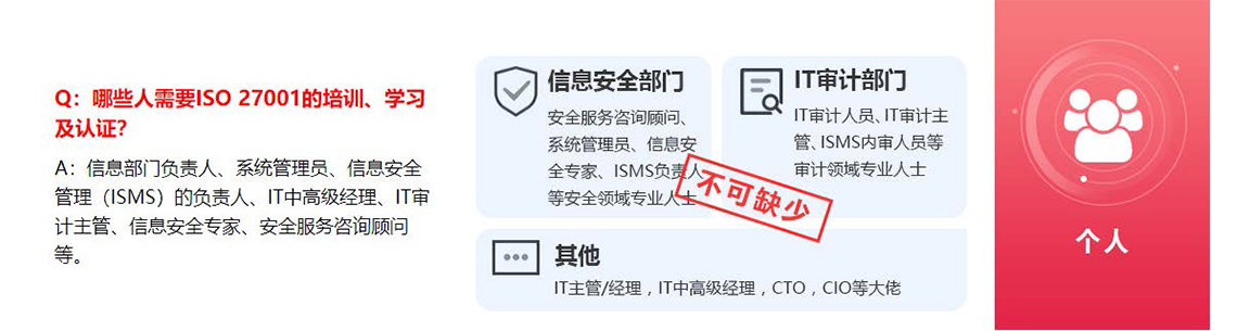 ISO27001 Foundation是学习信息安全管理系统(ISMS)的最佳入门认证,通过Foundation,学员可以学到ISO27001标准在组织中如何运作的基础知识。