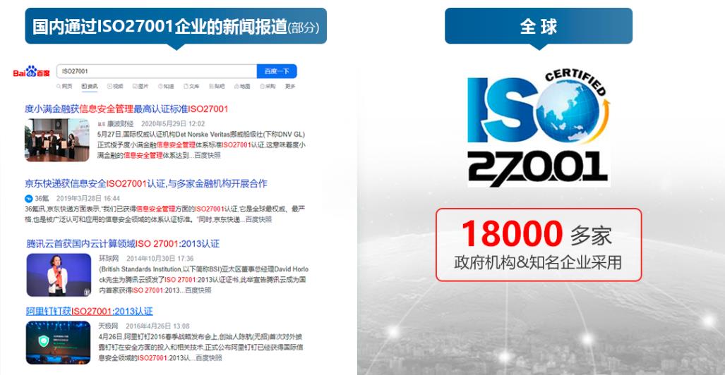 ISO27001是信息安全领域的管理最著名的权威标准,类似于质量管理认证的 ISO9000标准。当组织(企业)通过了ISO27001的认证,就相当于通过ISO9000的质量认证一般,表示组织(企业)信息安全管理已建立了一套科学有效的管理作为保障。