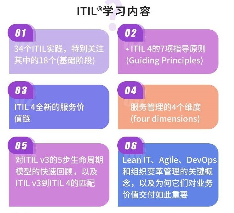 课程内容 | ITIL4的34个管理实践 ITIL4的7项指导原则 IT服务管理的4个维度 ITIL4服务价值链 精益、敏捷、DevOps及组织变革 |