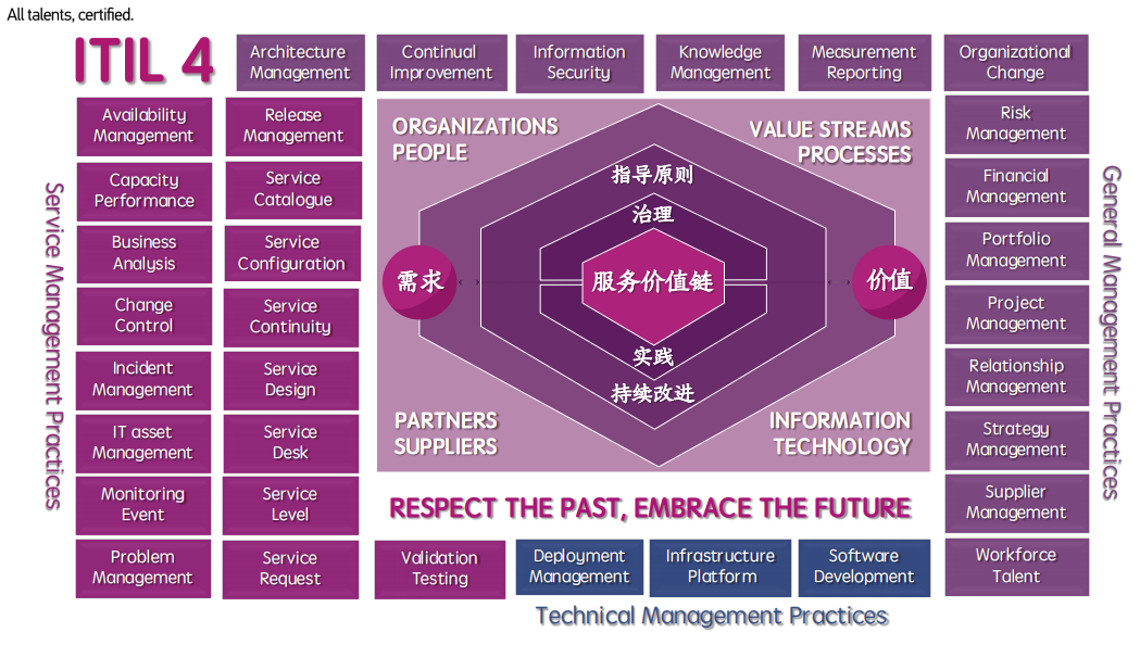 本课程引入ITIL 4,协助学员理解全新的IT服务管理的服务价值体系。ITIL4是目前世界范围内面向数字化时代的全面的知识体系,它与精益(Lean)、敏捷(Agile)和DevOps高度兼容,它能对组织的数字化转型提供强有力的支持,同时它也非常容易落地。