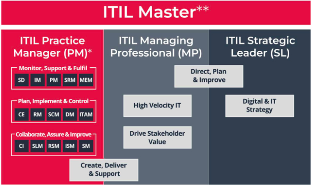 考试完成后当场出成绩。1-2个工作日可以下载电子证书,纸质的证书在45天左右到达艾威考试中心,到时艾威快递给到大家。 想要获取ITIL PM(实践经理)证书,需完成CDS + MSF(或PIC或CAI或5个子模块)认证即能申请获取。 想要获得ITIL Master(大师级)证书,需同时完成MP(职业经理人)+SL(战略领导者)+PM(实践经理)认证,即能自动获得,无需论文无需答辩 即:如果之前拥有了CDS、DSV、HVIT、DPI、DITS五张证书,只需要再考一门新出的Monitor, Support & Fulfil监控、支持和履行组合模块考试,通过后便可自动获得ITIL 4 MASTER证书。 |