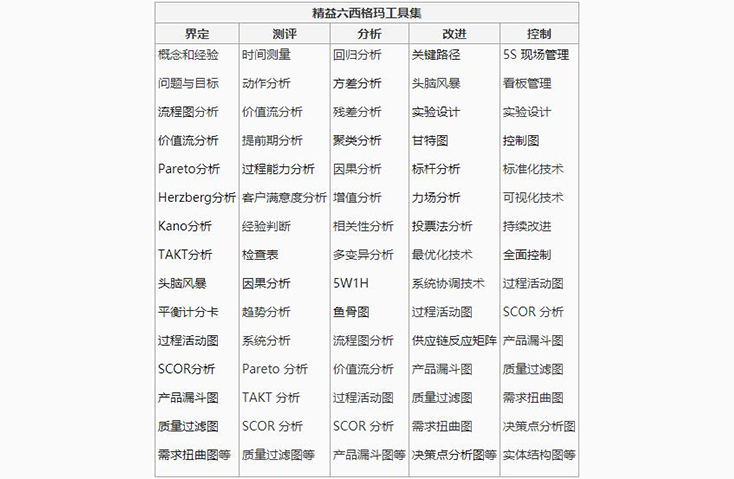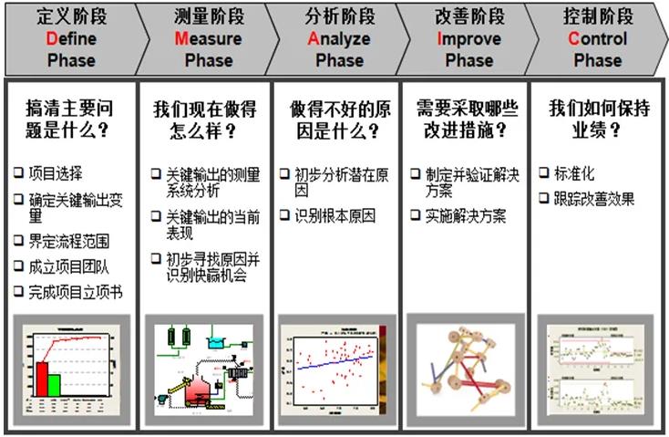 六西格玛管理建立在科学的统计理论基础上,它包括两个组成部分,即六西格玛设计和六西格玛改进。它一般采用项目管理的方式,采用DMAIC流程分析技术——定义(define)、测量(measure)、分析(analyze)、改进(improve)、控制(control)来实现产品和服务质量的持续改进。