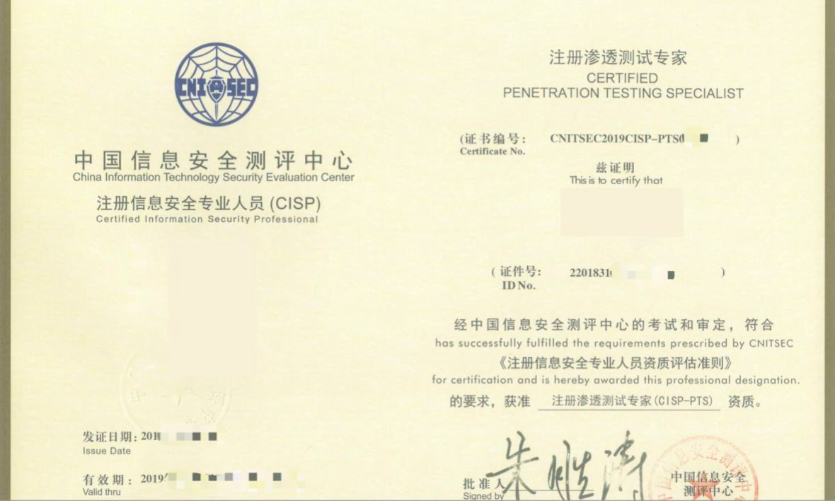 注册信息安全专业人员-渗透测试专家,英文为 Certified Information Security Professional - Penetration Testing Specialist,简称 CISP-PTS。证书持有人员主要从事漏洞研究、代码分析工作,具备对多种攻击方式的技术方法较全面掌握、对最新网络安全动态跟踪研究以及策划解决方案能力。