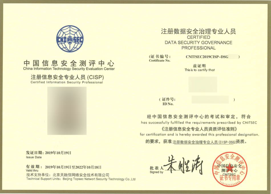 “注册数据安全治理专业人员”,英文为 Certified Information Security Professional - Data Security Governance,简称 CISP-DSG,是中国信息安全测评中心联合天融信开发的针对数据安全人才的培养认证,是业界首个针对数据安全治理方向的国家级认证培训。证书持有人员主要从事数据安全治理相关工作, 具有数据安全治理过程管理、数据安全技术体系设计、数据安全管理体系设计的基本知识和能力。