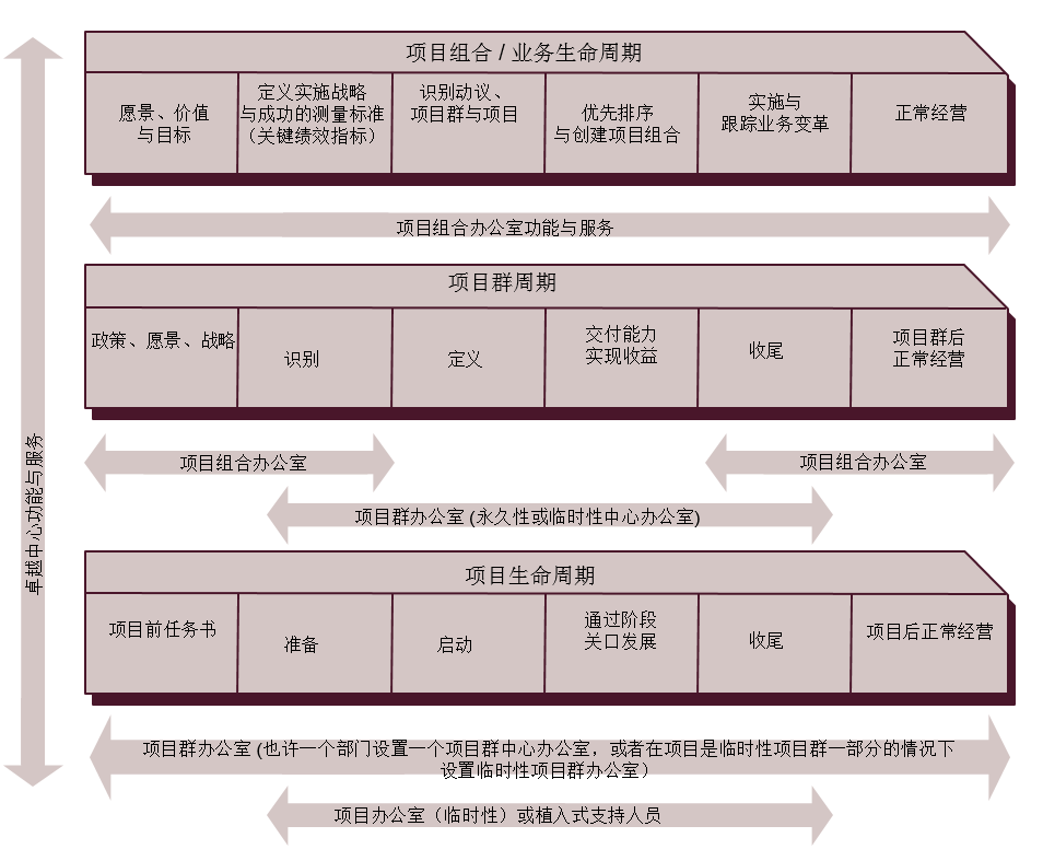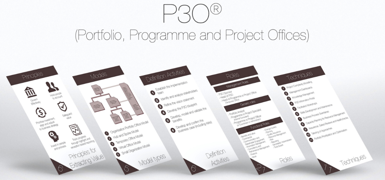 • P3O提供了普遍适用性的指南,包括原则、流程和技术,得以成功建立、发展和维护适当的支持结构。这些结构会促进商业目标(项目组合)的交付,项目群和项目组合收到时间、成本、质量以及其他组织问题的约束。