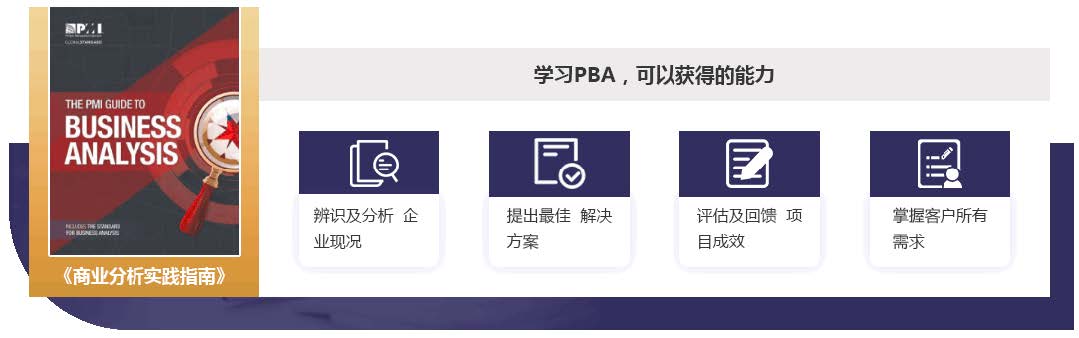 PBA基于《商业分析实践指南》,PBA提供有关如何将有效的商业分析实践应用于项目集和项目的指导,以实现成功的商业成果。PBA与PMP项目管理手法相互搭配,往往能取得更好的效果。